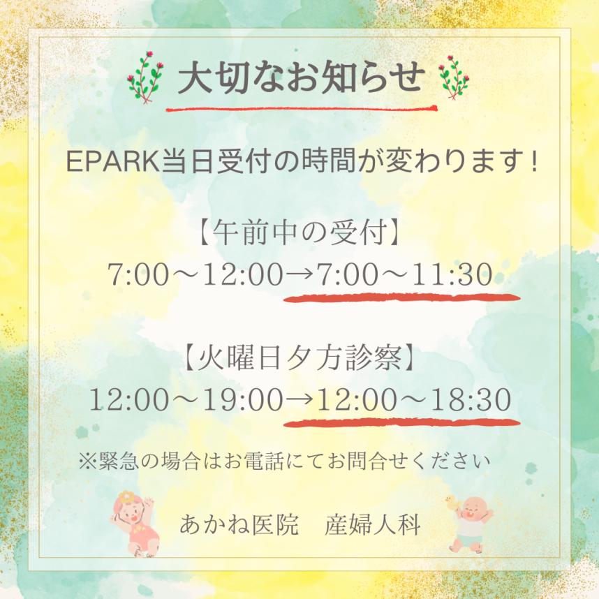 2025年04月19日(土) お知らせ 【産婦人科】EPARK当日受付時間変更のお知らせ 令和7年5月1日より、EPARKの申し込み時間を変更いたします。 ◎診察時間◎ 午前診察 9:00~12:00 火曜夕方診察 17:00~19:00 ◎WEB受付◎ 午前診察 7:00~11:30 火曜夕方診察 12:00~18:30 当日受診希望の場合、午前診察は11:30までに、火曜日の夕方診察は18:30までにWEB受付をお済ませください。 ご案内時間になりましたら、従来通りメールにてご連絡をしますので、ご自宅でお待ちください。
