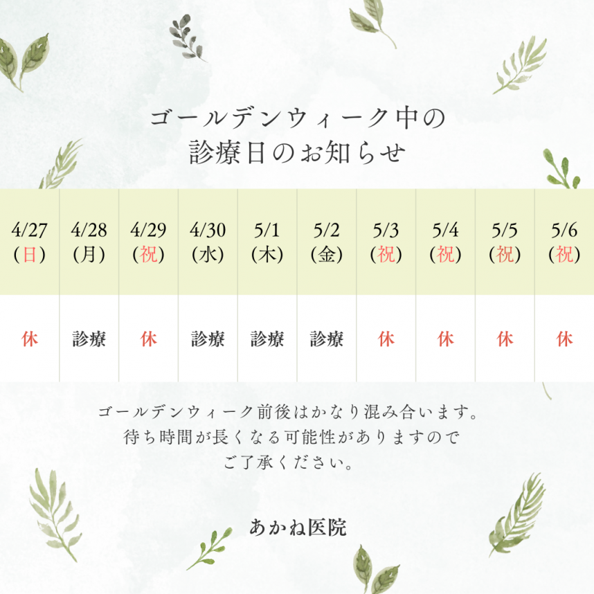 2025年04月16日(水) お知らせ ゴールデンウィーク期間の診療日について ゴールデンウィーク期間の休診日についてご案内です。 産婦人科・小児科ともにカレンダー通りです。 待ち時間が長く発生する可能性がございます。 ご了承ください。