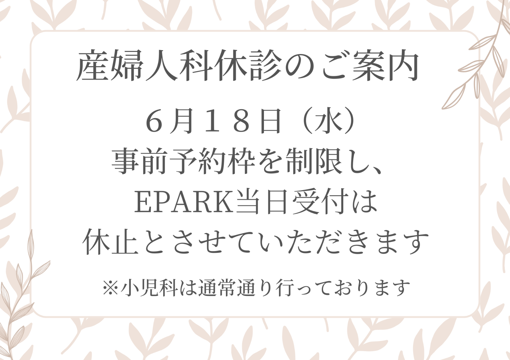 2025年06月03日(火) お知らせ 【産婦人科】予約制限のお知らせ 6月18日(水)産婦人科の診察は、当院の都合により事前予約の方のみの診察とさせていただきます。 EPARKの当日受付は休止とさせていただきます。 ※当日は代務医師の診察となります。緊急の方はお電話にてご相談ください。 ★小児科は通常通り診察しております。